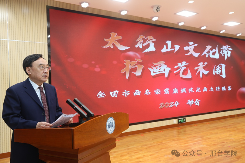 宋贵伦宣读中华文化促进会贺信并致辞。他表示,党的十八大以来,党中央推动长城文化带、大运河文化带等一系列文化带的发展战略,太行山文化带工作委员会的成立,是国家文化发展战略的需要,也是推进太行山文化带发展的需要。中华文化促进会太行山文化带工作委员会和广大书画名家将以此次活动为契机,认真学习贯彻习近平文化思想,大力弘扬太行文化,支持邢台“文化兴市”战略不断取得新成果,加快推动太行山文化带建设。