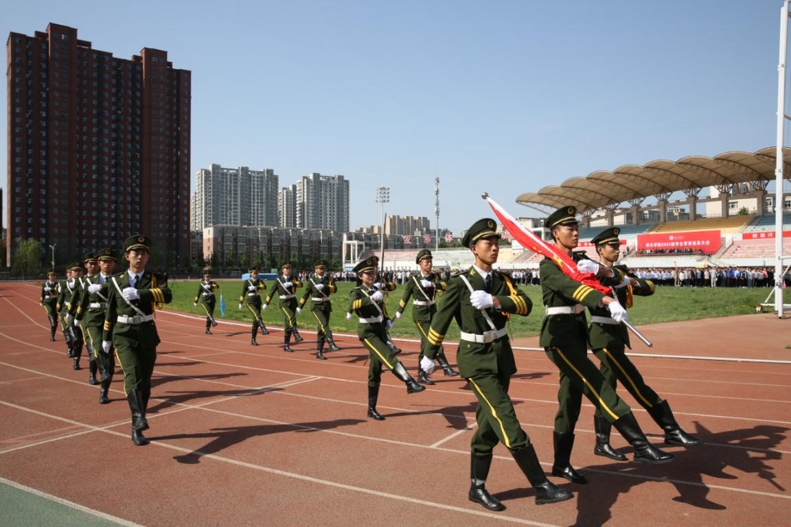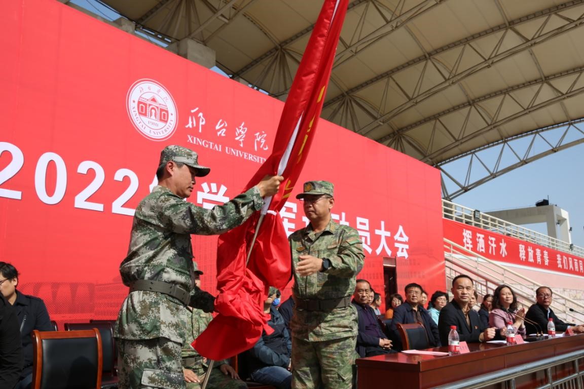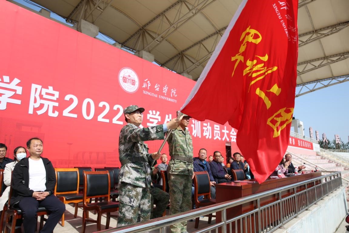大会在庄严的升旗仪式中拉开序幕。学生处处长庄泰岳对2022级学生军训重点工作作了安排,宣布成立邢台学院2022级学生军训团。王首书分别向军训一团、军训二团授旗。