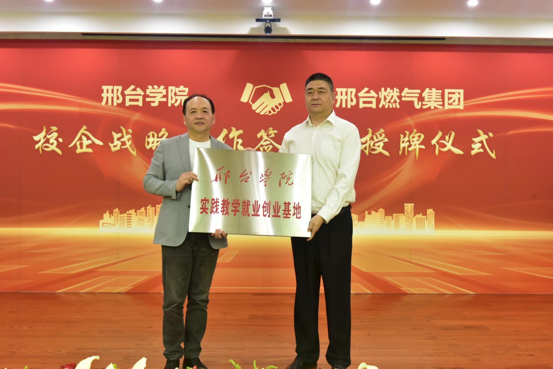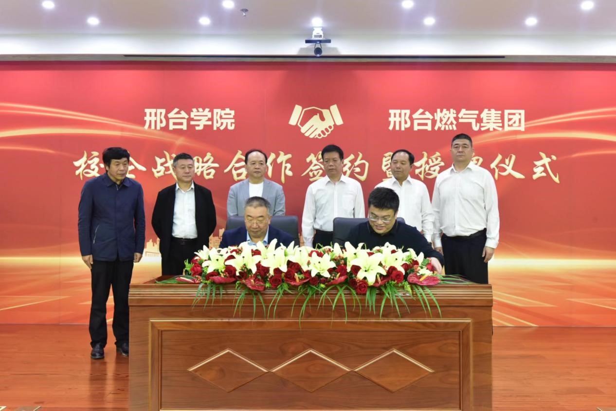 5月9日下午,邢台学院与邢台燃气集团有限责任公司战略合作签约暨授牌仪式在信都区邢燃大厦隆重举行。邢燃集团总经理杜楠,副总经理于志宏、邓俊杰,集团部门总经理刘健,我校校长蔡振禹,副校长王自力,以及相关职能部门负责人出席签约仪式。