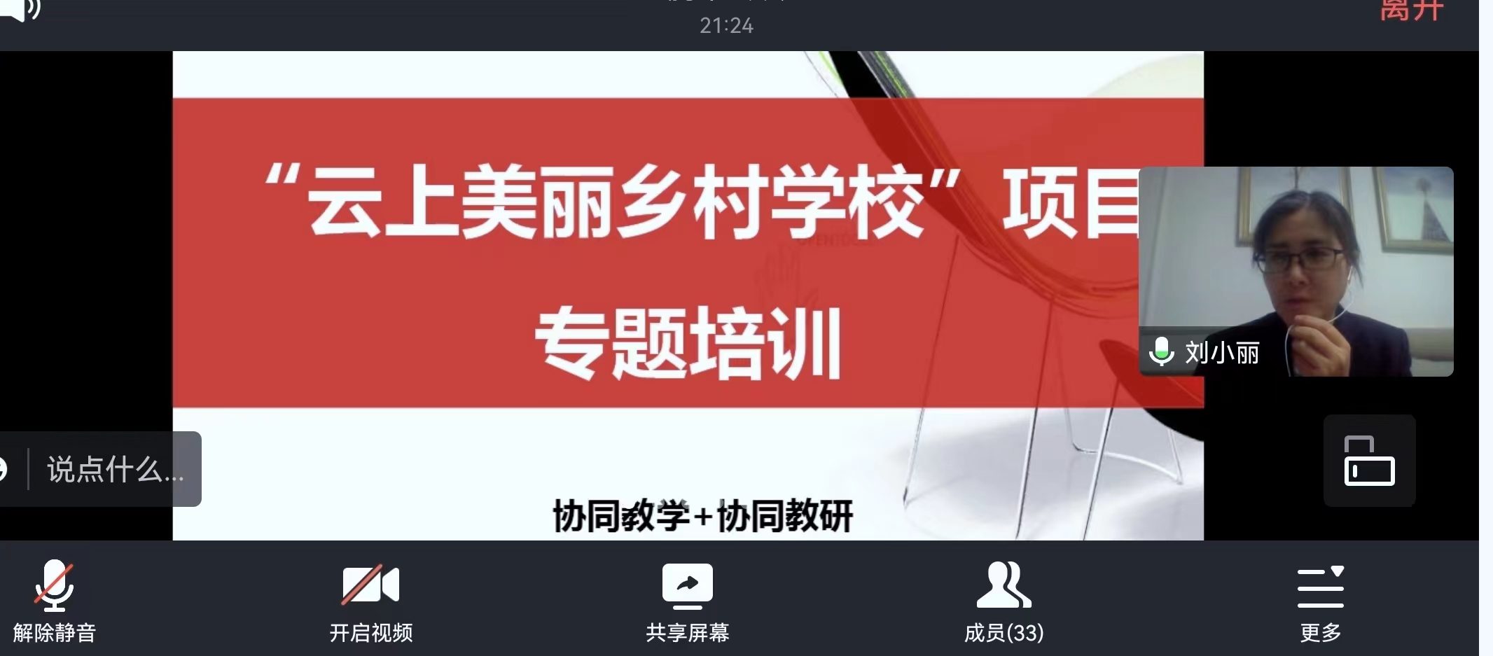 2023年1月12日晚上,项目组线上召开了“云上美丽乡村学校”威县项目全体成员见面暨培训会。本次会议由教育科学教学部主任王凌霞主持,项目组指导教师团队的许澄、张志强、刘小丽、王欣、安英红、安晓静和音乐、美术、心理健康教育三支师范生支教服务小分队成员参加了会议。会上,王凌霞主任对大家给予项目的支持表示感谢,希望全体成员齐心协力为乡村基础教育服务。许澄老师、张志强老师分别谈了对项目的看法并鼓励学生们在项目中锻炼、成长。刘小丽老师开展了“云上美丽乡村学校”项目专题培训,就如何开展“协同教学”与“协同教研”进行了介绍。项目组学生团队成员也信心满满。