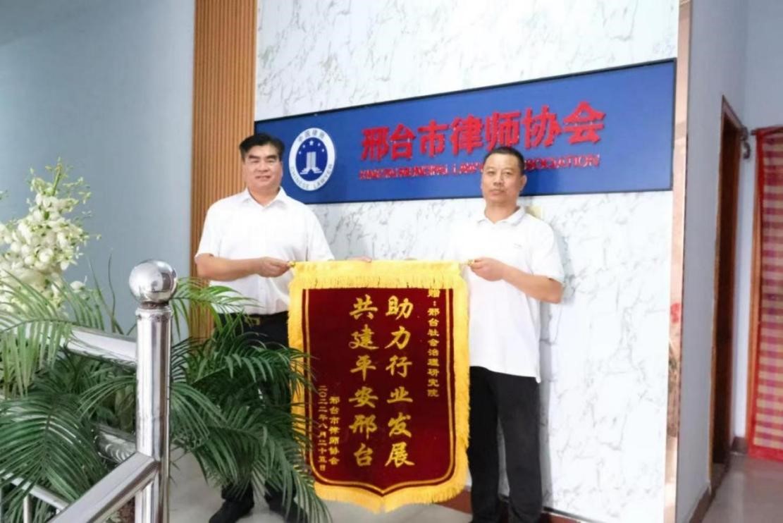 邢台社会治理研究院秘书长贺天宇接受邢台市律师协会会长张之永赠送锦旗