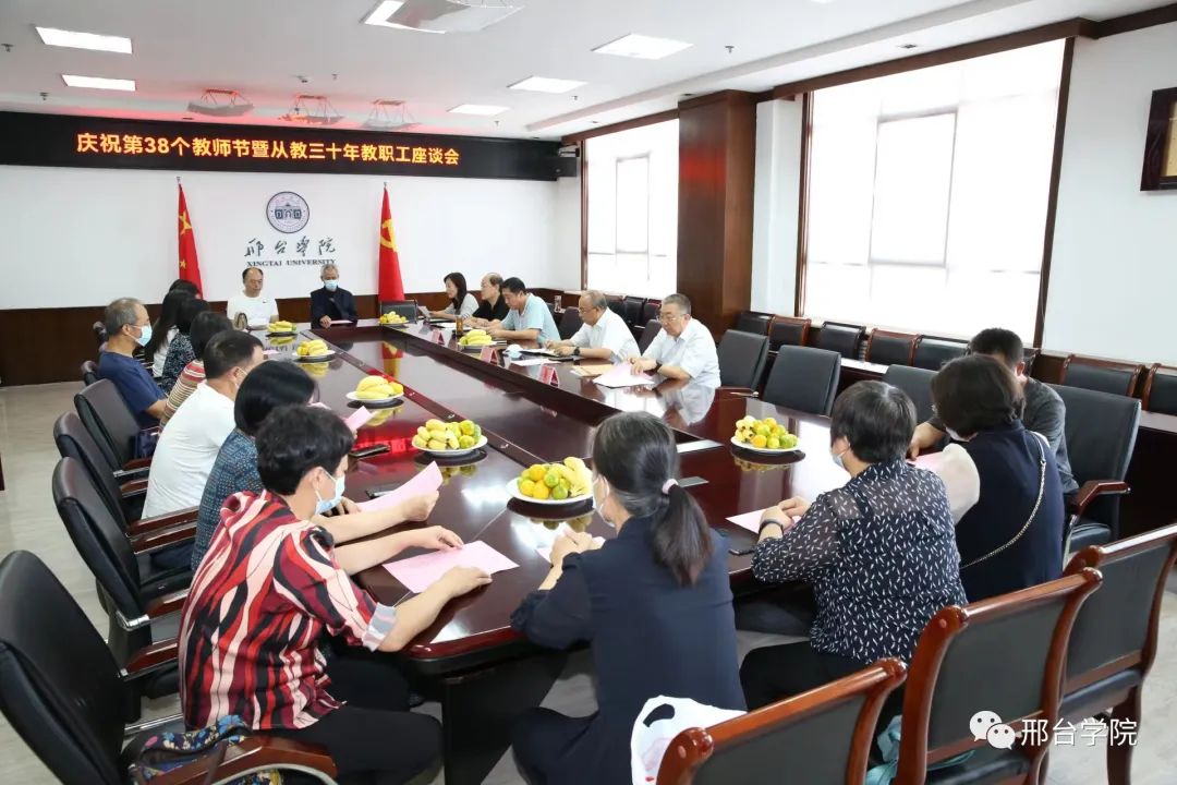 9月8日下午,在第38个教师节来临之际,我校在主楼12楼会议室召开了庆祝第38个教师节暨“光荣从教三十年”教职工座谈会。党委书记侯贵星、校长蔡振禹、党委副书记赵建彬与37位“从教三十年”教职工代表欢聚一堂,畅所欲言,共同庆祝教师节。会议由校工会常务副主席王士华主持。
