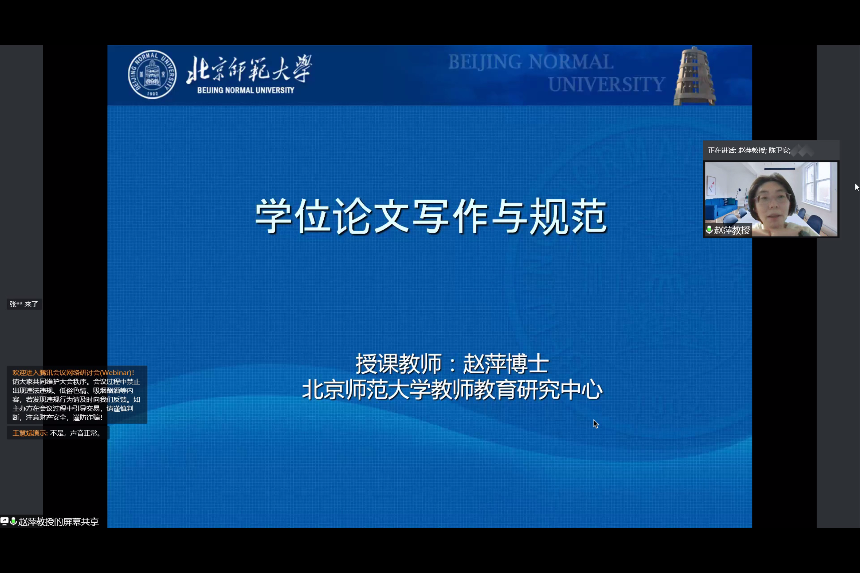 为进一步提升我校教师毕业论文(设计)指导水平,促进毕业论文(设计)指导更加规范,切实提高师范专业人才培养质量,助力新师范理念落实和师范专业认证顺利开展。12月21日,我校聘请教育部普通高校人文社会科学重点研究基地北京师范大学教师教育研究中心赵萍副教授为我校教师开展讲座。讲座由教务处处长陈卫安主持,我校400多名师范专业教师线上聆听了讲座。