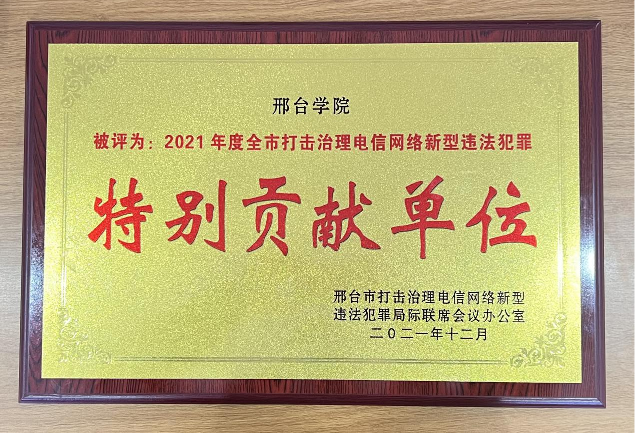 近日,邢台市打击治理电信网络新型违法犯罪局际联席会议办公室授予我校“2021年度全市打击治理电信网络新型违法犯罪特别贡献单位”称号。