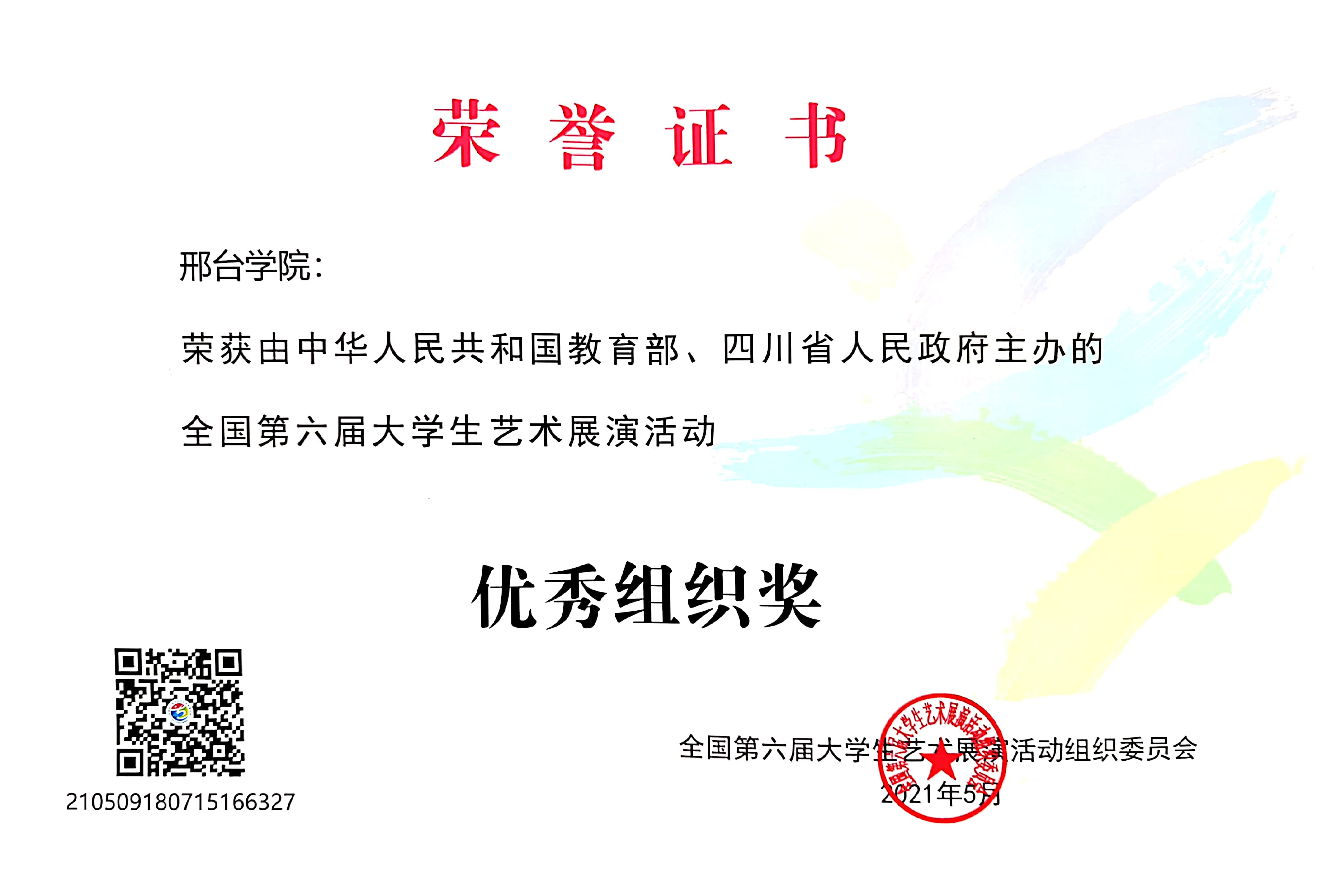 经过河北省教育厅的推选,我校李婷花老师指导学生完成的绘画《别怕,疫情面前我们还有你》,刘兴武、黑秀国、王珊老师指导的合唱作品《掀起你的盖头来》,张志强、胡晓敏老师完成的《中华优秀传统文化推进高校美育实践——以邢窑国家级非物质文化遗产为例》高校美育改革创新案例三件作品参加了由教育部和四川省人民政府主办的全国第六届大学生艺术展演活动,并分别取得艺术作品甲组二等奖、艺术表演乙组三等奖和美育改革创新优秀案例三等奖的好成绩。