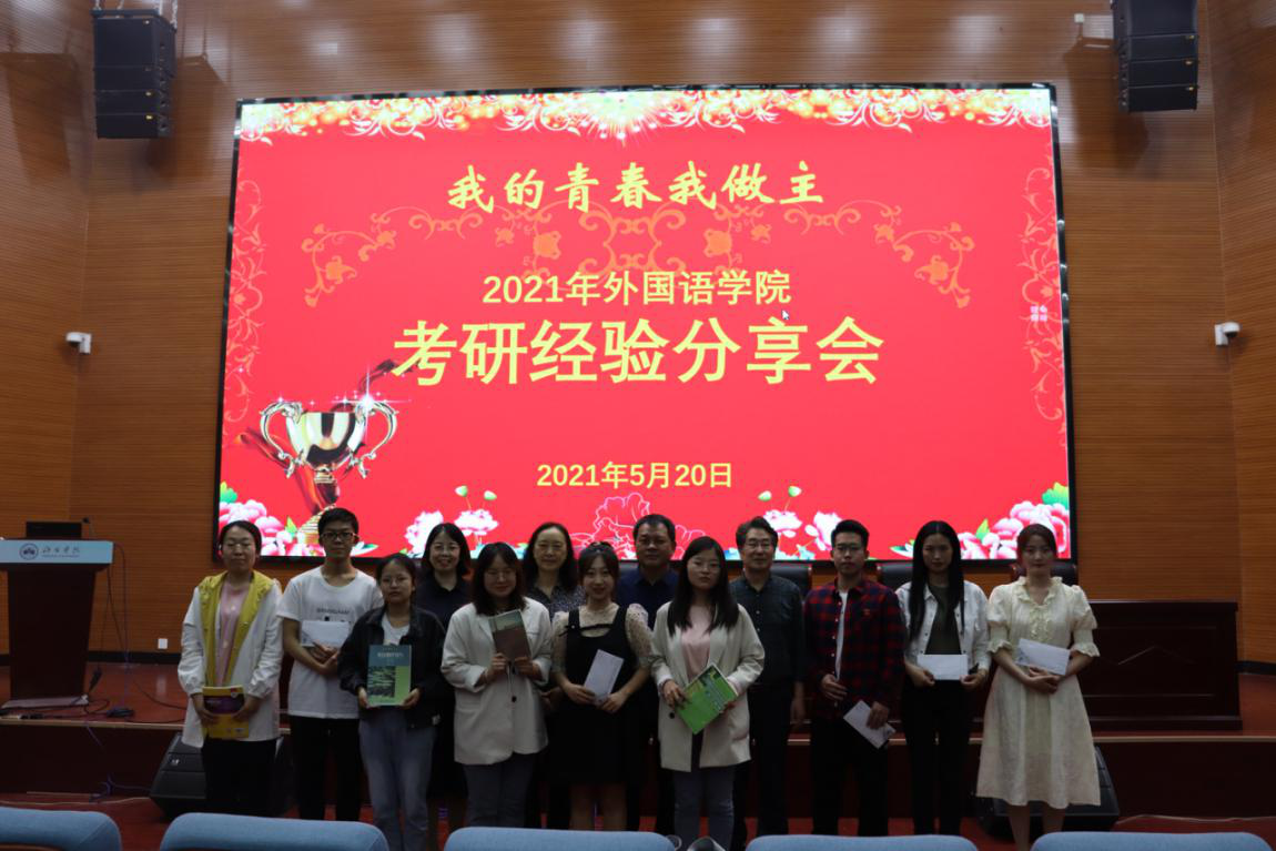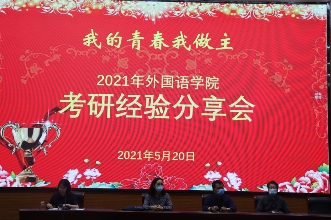针对学生就业的严峻形势和考研所面临的问题,为进一步提高外国语学院人才培养质量,加强专业和学风建设,推动学生的学习积极性主动性,帮助更多同学走近心仪的高校继续深造,翻译教研室和院团委于5月20日晚联合举办了“我的青春我做主”2021年考研经验分享会。学院全体领导班子成员、教师代表、翻译专业和英语专业同学共计约200人参加了活动。
