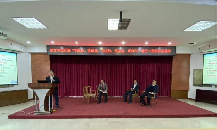 为深入贯彻习近平依法治国思想,进一步增强师生法律意识和法治观念。11月2下午,我校在图书馆学术报告厅开展了“学政治、强师风、守法纪、重安全、正风气”活动——普法宣传讲座。法政学院薄国旗、赵立伟、卫守宇和李建军四位老师为学校师生带来了一次精彩的普法知识讲座。