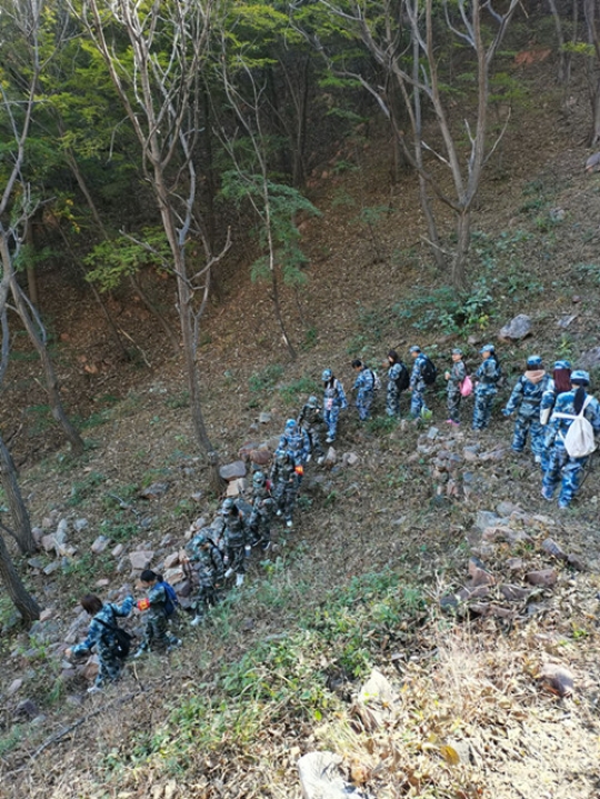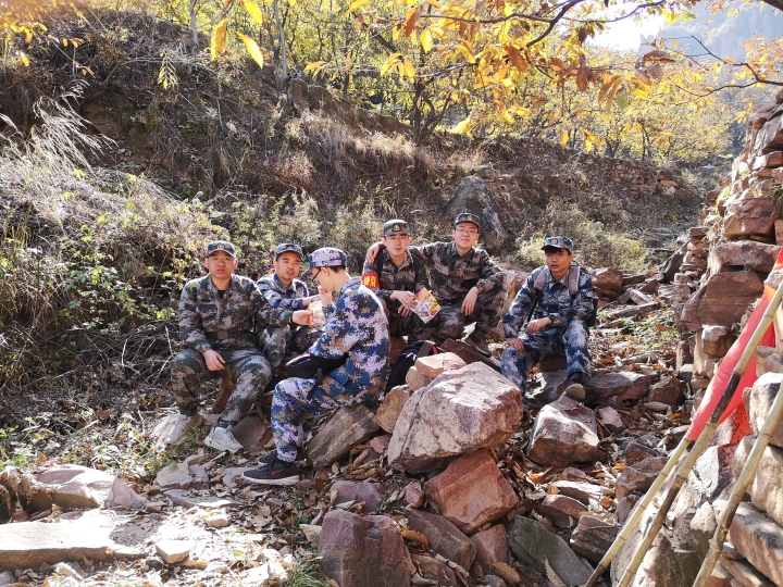 从桃树坪出发,学生在老师的带领下踏上了小长征之旅。踏着先辈的足迹,师生沿途跨过小河,穿过清家沟村,沿着羊肠小道,爬上纱帽山,旅途中学生们深刻体会到了当年抗大学员行军的艰辛。为表达对抗大学员的崇高敬意,师生们在山顶齐声高喊“抗大,抗大,越抗越大!”、“思政,思政,越思越正!”