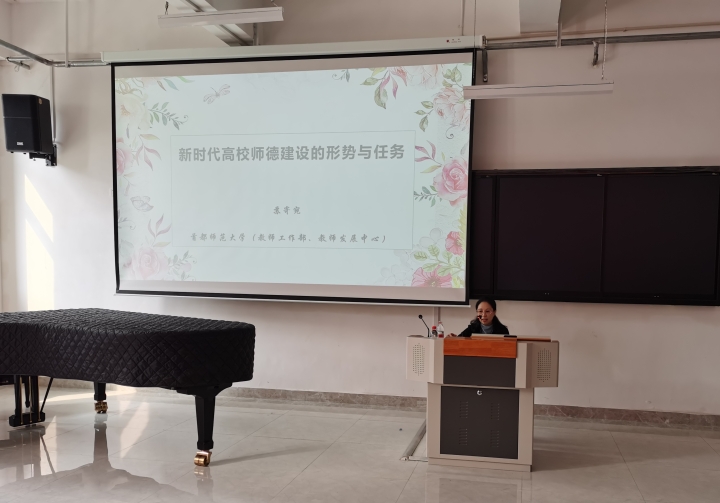 9月22日,首都师范大学教师工作部部长、北京市人民政府督学苏寄宛教授应邀为我校青年教师开展了师德师风专题讲座。本次讲座由我校教师发展中心主办,人事处负责人张兰英主持,八十余名青年教师参加,副校长肖士恩出席了会议。