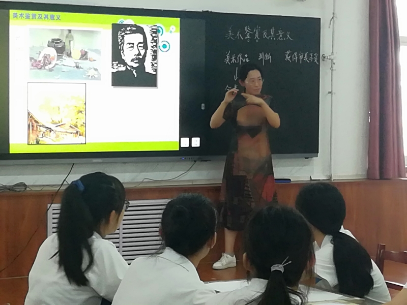 民盟盟员蔡杰老师,作为美术教学领航者,也是河北省美术名师工作室的主持人。这位美丽的老师,用她唯美的语言和丰硕的知识,为学生呈现了一堂既有实践、又有理论的美术赏析课。她的理论生动活泼,配合美术作品的欣赏实践,让学生在轻松的氛围中获得了更多的理论启发。