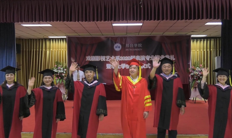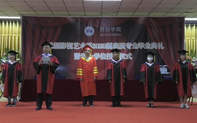 根据《邢台学院2020届毕业生线上学士学位授予仪式的说明》,戏剧影视艺术系按照学校统一安排和部署,积极行动起来,决心在线上也要给毕业生一场庄严隆重的学士学位授予仪式。杨群波老师与毕业班学生多次沟通,征求学生意见。王志红老师、杨素霞老师与负责毕业班的老师和负责技术支持的老师设计了一套又一套方案。经过两周的紧张筹备,终于录制完成了时长一小时五十分钟的视频,不仅保证线下毕业典礼和学士学位授予仪式的各个环节一个不少,为了缓解学生对学校的思念和平抚他们心中的遗憾,还特别延长了每名毕业生表达愿景和对学校祝福环节时间达四十分钟,为每一名毕业生留足了时间。