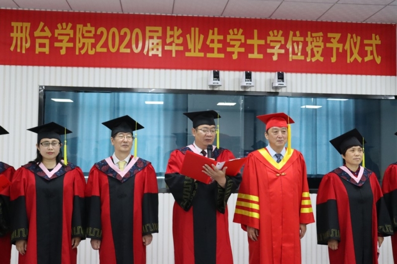 2020年6月21日上午,邢台学院外国语学院2020届本科毕业生学士学位授予仪式在教辅楼创新大课堂隆重举行。学校党委常委、副书记赵建彬教授,学院领导班子成员、教师代表和辅导员老师在现场参加了授予仪式。2020届全体本科毕业生和家长在各自家中,以视频方式参加了授予仪式。