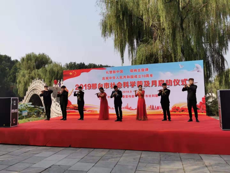 9月27日上午,邢台市达活泉公园。由邢台市委宣传部、邢台市社科联举办的主题为“礼赞新中国唱响主旋律——庆祝中华人民共和国成立70周年”邢台市社会科学普及月启动仪式举行,我校音乐舞蹈学院师生共同为启动仪式奉献了小合唱、男生独唱、笛子演奏、古筝演奏等精彩节目,受到与会领导、市社科联等参会人员及现场观众的热烈欢迎,并对学生精湛的演技、高超的艺术素质给予了高度评价。