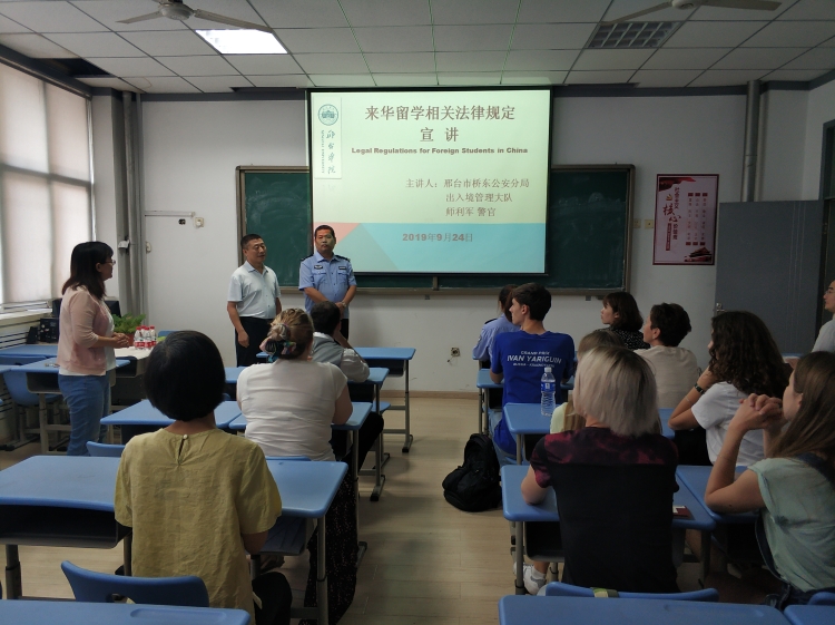 为促进我校的平安校园建设,提高我校留学生及外籍教师的守法、懂法意识,帮助外籍师生进一步了解《中华人民共和国出境入境管理法》等相关法律法规,9月24日下午,国际教育交流学院特邀邢台市桥东公安分局出入境管理大队师利军警官为我校外籍师生进行专题宣讲,学校相关部门人员和在校的外籍师生参加了此次活动。