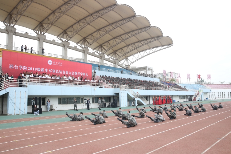 上午8:30,伴随着雄壮的国歌声,军训总结表彰大会暨开学典礼正式拉开序幕。在雄壮昂扬的检阅进行曲中,14名国旗护卫队成员迈着坚毅的步伐行进在队列最前端,护卫着中华人民共和国国旗和中国人民解放军军旗。由2019级新生组成的37个方阵,精神抖擞、斗志昂扬,迈着整齐有力的步伐,喊着雄壮嘹亮的口号,依次经过主席台接受检阅。捕俘拳、捕俘刀的训练科目表演,动作整齐规范,口号铿锵响亮。之后,校党委书记侯贵星向承训部队官兵赠送了锦旗。副校长徐惠敏宣读了《邢台学院关于表彰2019级新生军训先进集体和个人的决定》,校领导和嘉宾为在军训中表现突出的军训教官、先进个人、十佳标兵、先进集体颁发了证书、奖牌。