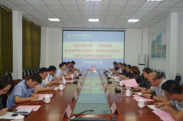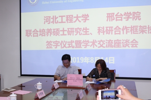 在大家共同见证下,何立新副校长与徐惠敏副校长代表双方学校正式签署河北工程大学-邢台学院联合培养硕士研究生、科研合作框架协议两份文件。双方将在协议框架下,加速落实硕士研究生联合培养和相关领域的科研合作,促进共同发展。双方一致表示两份协议的签署必将有力推进双方人才培养和科学研究的快速发展,更好的服务和引领区域经济社会发展。