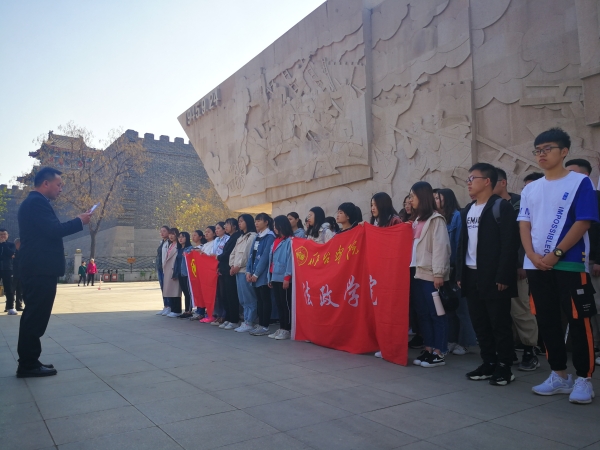 4月1日下午,法政学院团委书记岳锐洁、学管办主任吴明君和辅导员李少伟三位老师,带领40余名学生来到历史文化公园,在邢台解放纪念碑前列队肃立。学管办吴明君主任带领大家一起回忆了邢台解放的光辉历史,团员学生在纪念碑前重温入团誓词,学生代表孙浩作了题为《缅怀先烈 珍惜现在 展望未来》的演讲,随后师生一同瞻仰了纪念碑。