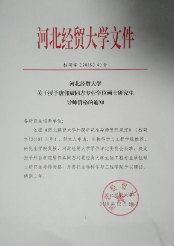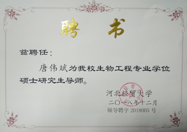 近日又传来喜讯,我校数学与信息技术学院和燕山大学信息科学与工程学院签署了联合培养硕士研究生框架协议,生物科学与工程学院唐伟斌教授被河北经贸大学聘为硕士生导师。