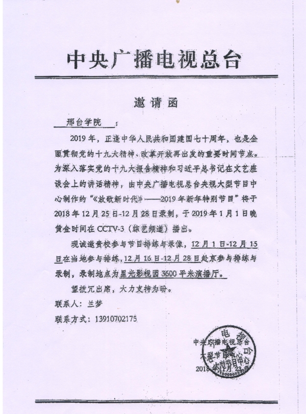 近日,学校收到中央广播电视总台大型节目中心发来的邀请函,邀请我校音乐学院舞蹈学专业100名学生赴京参加《放歌新时代》——2019年新年特别节目的演出。节目将于2019年1月1日晚黄金时间在CCTV-3(综艺频道)播出。据悉,此次受邀参演的高校包括邢台学院只有5所,我校不仅是河北省唯一受邀高校,也是唯一一所地方本科院校。这场演出是央视在明年恰逢中华人民共和国成立七十周年,也是全面贯彻党的十九大精神、改革开放再出发重要时间节点,为深入落实党的十九大精神和习近平总书记在文艺座谈会上的讲话精神而精心打造的一场文化盛宴。这是继9月份舞蹈学专业学生参加央视《欢声笑语迎国庆》特别节目后,再次喜获央视邀约,在全国瞩目的央视舞台上一展风采,并且吉林电视台卫视频道与北京北奥盛典国际文化发展有限公司也先后发函诚挚邀请舞蹈学专业学生参加吉林春节联欢晚会和2019北京新年倒计时活动暨北京冰雪文化旅游节开幕式节目录制,诸多省外大型活动邀约,着实让师生欢欣鼓舞、倍感振奋。