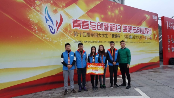 11月8日至11月12日,由新道技术有限公司和高等学校国家级实验教学示范中心主办的“第十四届新道杯沙盘模拟经营大赛全国总决赛”在中南财经政法大学举行。我校经济与贸易学院派出由刘浩老师指导,以温亚鹏、李泽毅、果志雄、徐玲玲、闫冰倩5名学生组成的代表队在比赛中荣获三等奖。
