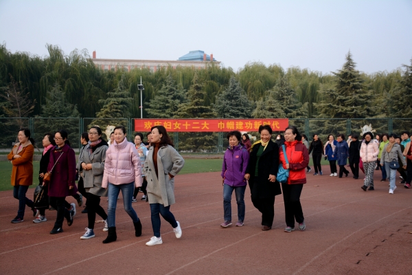 为了深入学习习近平新时代中国特色社会主义思想,贯彻落实全国十二次妇代会精神,丰富我校女教职工业余文化生活,展示我校女教职工精神风貌,11月12日下午,校工会、妇委会在二号操场举办女教职工健步走健身活动。活动以“欢庆妇女十二大,巾帼建功新时代”为主题,近五百名女教职工参加了健步走活动。