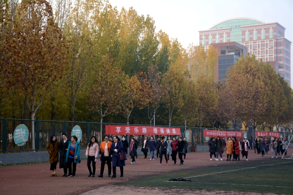 初冬的邢台学院,美丽依然,渐黄的树叶给校园又添上一抹绚丽的色彩。下午四点,几百名女教职工从各自工作岗位赶到运动场,宽阔的运动场顿时热闹起来。体育学院副院长张玉荣教授首先给大家讲解走路的要领、注意事项和不良走姿的危害,高声宣布健步走活动开始,伴着轻快的乐曲,女教职工们身着五颜六色的运动鞋服在红绿相间的塑胶跑道上相互携手,阔步前行。大家一边欣赏校园美景,一边说说工作说说生活,心情愉悦,谈笑风生。远远望去,健步走的队伍整齐有序,矫健英姿与五彩校园相得益彰,形成了一道校园靓丽风景线。
