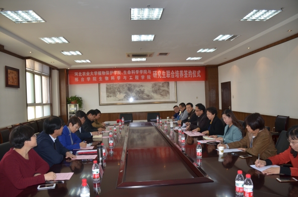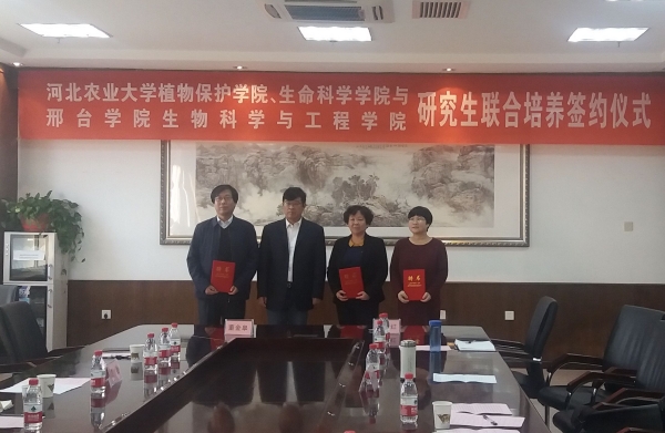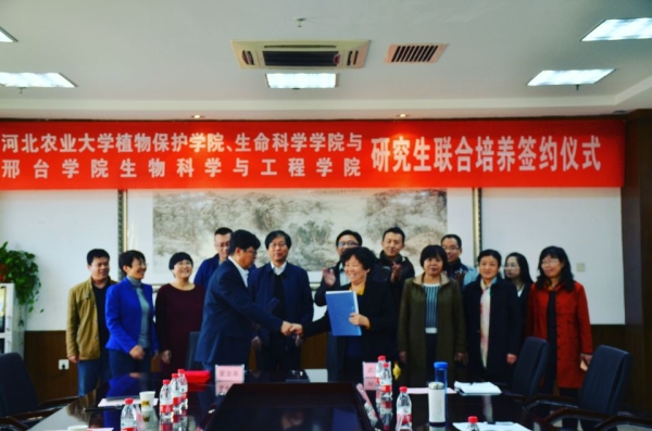 邢台学院生物科学与工程学院与河北农业大学植物保护学院、生命科学学院研究生联合培养签约仪式于2018年10月27日隆重举行。邢台学院生工学院院长武宇红教授与河北农大植保学院、生科学院院长董金皋教授分别代表各自学院在协议书上签字。随后,董金皋院长分别向武宇红教授、王僧虎教授和唐蕊教授颁发了外聘硕士生导师证书。河北农大经济贸易学院副院长路剑教授、生科院张洁博士、邢台学院学位办主任张兰英教授和部分教师代表出席了签约仪式。生工学院副院长唐伟斌教授主持仪式。