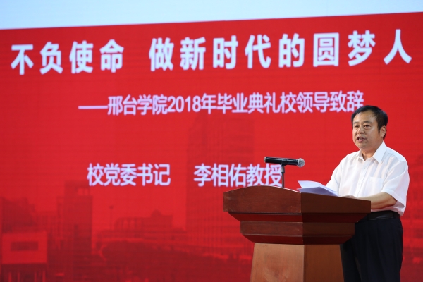 今天,我们欢聚一堂,隆重举行邢台学院2018届学生毕业典礼。首先,我代表学校,向圆满完成学业,即将扬帆起航的同学们,表示最热烈的祝贺!对倾心培养同学们成才的全体教师,各学院(系部)、职能部门和教辅单位的干部职工表示衷心的感谢和崇高的敬意!