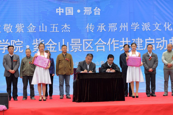 邢台学院是邢台唯一一所综合性本科院校,其中师范教育已经有107年的办学历史,研究挖掘、传承创新紫金书院文化,研究她的课程设置、教学模式及方式方法,将其与邢台学院百年师范教育精华融会贯通,对于深化我校师范教育教学改革,在基础教育阶段全面推行素质教育、通识教育具有重大意义。我校将以紫金书院研究中心为平台,与紫金山景区建立战略合作关系,双方将发挥各自优势,共同致力于紫金山书院科技创新人才育人模式的挖掘和文化旅游产业发展新途径的探索。