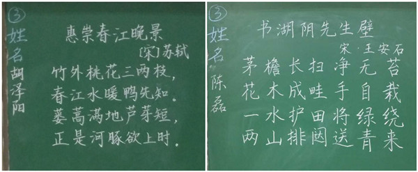 粉笔字类作品或刚劲有力、潇洒飘逸;或大方得体、秀气隽美。胡泽阳同学书写时气定神闲,全神贯注,他为大家带来的《惠崇春江晚景》字迹如行云流水,疏朗灵动;美术与设计学院的陈磊同学书写的《书湖阳先生壁》结构整齐划一,字迹端秀清丽,自然舒展。