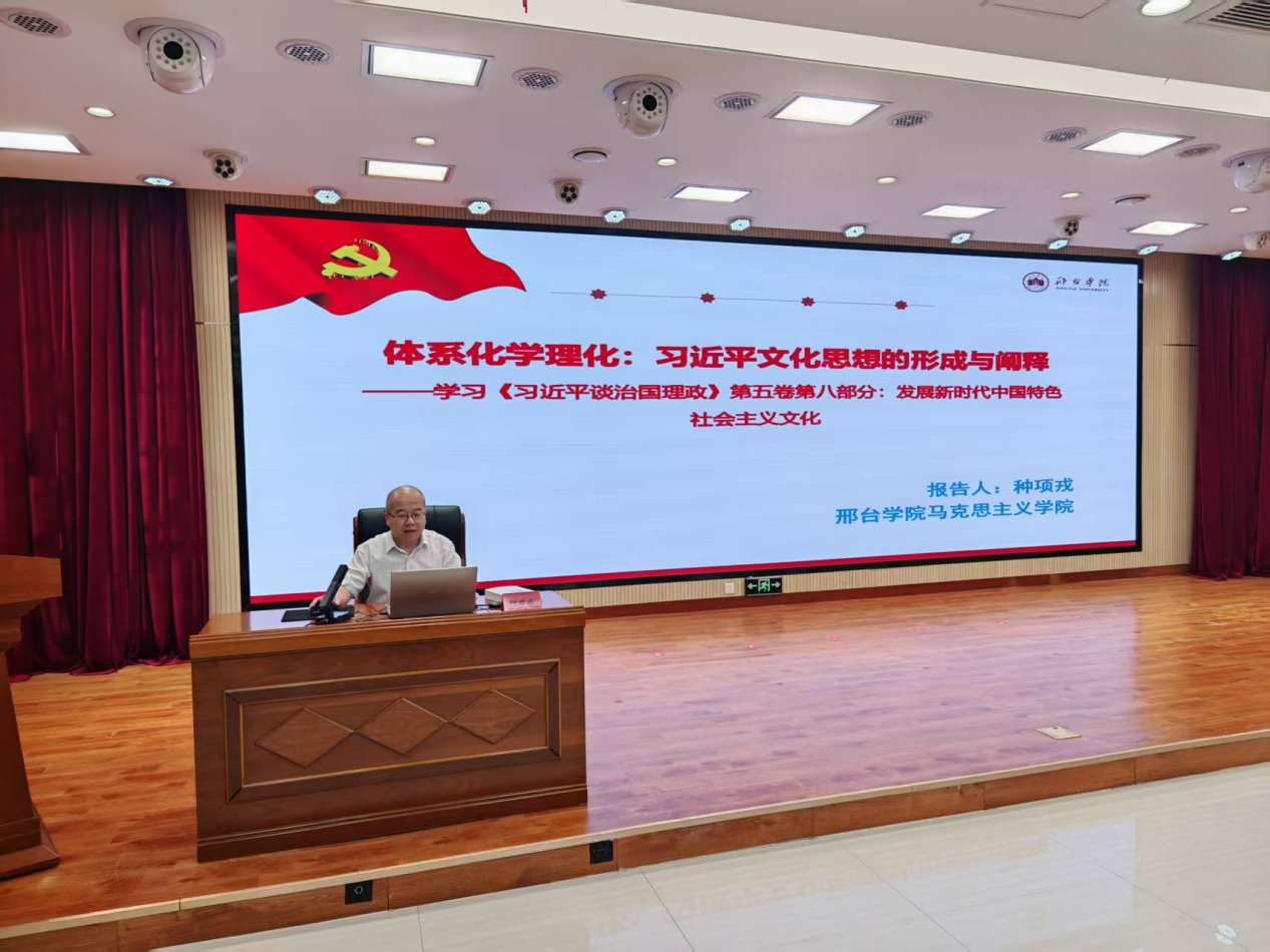 宣讲中,市委党校刘素娟教授以《闪耀真理光芒的光辉文献 引领伟大征程的行动指南》为题,从时代背景与总体把握、核心内容与精髓要义、重大意义与理论贡献、深远影响与历史地位四个方面,用生动的语言、翔实的案例,对《习近平谈治国理政》第五卷进行了系统阐述和深刻讲解,帮助师生深刻理解习近平新时代中国特色社会主义思想的精髓要义。邢台学院种项戎博士以《体系化学理化:习近平文化思想的形成与阐释》为题,从深化党的创新理论体系化学理化研究的重要意义、“体系化”“学理化”研究阐释的内涵、习近平文化思想的体系化学理化三个维度,重点对《习近平谈治国理政》第五卷“发展新时代中国特色社会主义文化”部分进行详细解读,引导广大师生自觉做新时代党的创新理论的坚定信仰者和忠实实践者。