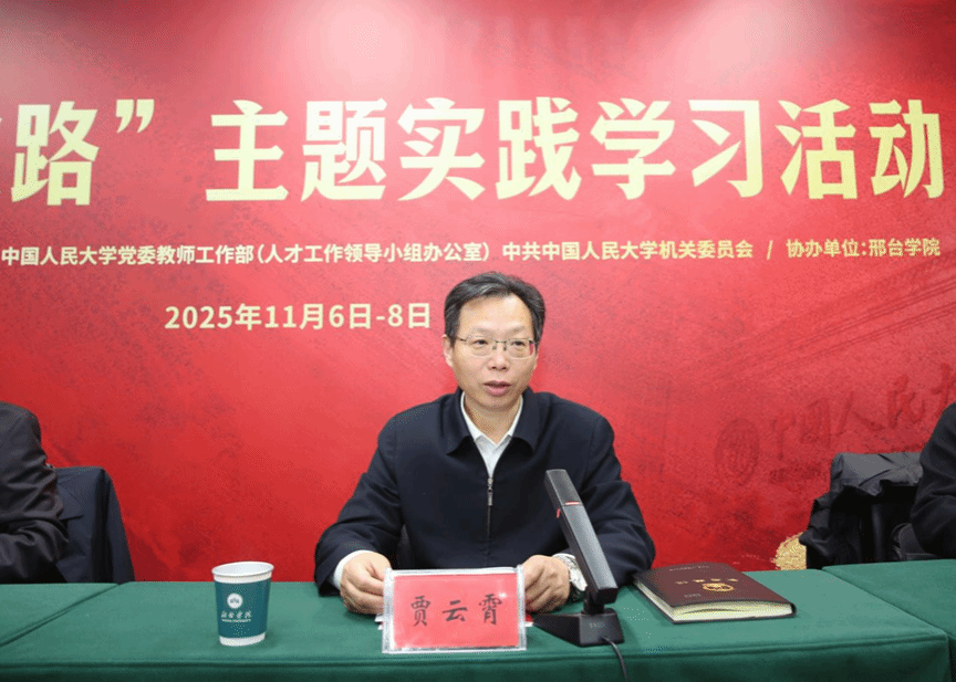 贾云霄对中国人民大学一行到我校开展研学活动表示热烈欢迎,对中国人民大学长期以来给予我校的支持和帮助表示感谢。他指出,近年来我校深入贯彻“一三六九”工作思路,坚持“扎根地方、向为图强、家国情怀、世界眼光”的工作理念,全力推进应用转型和硕士学位授予单位建设,努力朝着建设高水平有特色的应用型大学目标迈进。他指出,北方大学是抗日战争胜利后,中国共产党创办的第一所学科齐全的综合性大学,初创时期在邢台办学,为解放战争和新中国社会主义建设培养了大批人才,为新中国高等教育事业发展奠定了扎实基础。新中国成立后,在北方大学基础上衍生和发展了中国人民大学、北京理工大学、中国农业大学、中央美术学院等众多高等学府,这些高校扎根祖国大地,为新中国建设作出了重要贡献。北方大学在邢台办学期间,为邢台留下了非常宝贵的精神财富,中国人民大学主题实践学习活动在我校举行具有重要意义。希望双方以本次活动为契机,进一步加强交流合作,持续挖掘北方大学办学历史,传承红色办学基因,追寻中国高等教育的初心使命。同时也希望中国人民大学能够一如既往地在学科建设、科学研究、研究生教育等方面给予我校指导和帮助,共同谱写新时代中国特色社会主义教育事业新篇章。