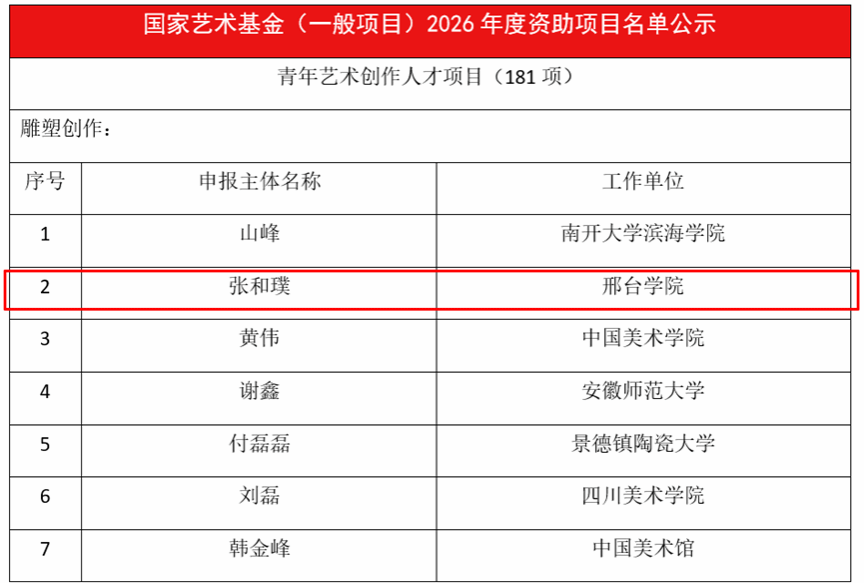 近日,国家艺术基金管理中心公示了《国家艺术基金(一般项目)2026年度资助项目名单》,我校艺术学部美术与设计学院张和璞老师获批青年艺术创作人才项目,实现了我校在国家艺术基金项目上的历史性突破。