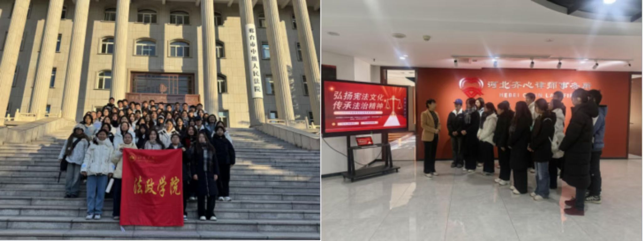 当日,校团委和法政学院团委还联合举办了“学习宣传贯彻习近平法治思想,推动宪法深入人心”主题宣传活动。学生们深入到校园与社区,用通俗易懂的语言向广大市民和同学解读法律条文、发放普法资料,推动宪法精神在基层落地生根。同时,法政学院还与邢台市中级人民法院、邢台市领航律师事务所等五家单位联合开展“国家宪法日”共建活动,组织师生走进司法一线实地参观学习,在真实的法治场景中,近距离感受法律的庄严与神圣。
