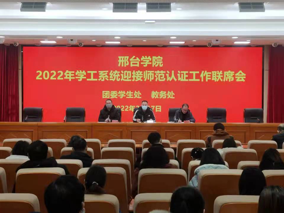 2月17日上午,我校在图书馆学术报告厅召开了“邢台学院2022年学工系统迎接师范认证工作联席会”。党委常委、副校长肖士恩出席会议。教务处处长陈卫安,各院(系部)副书记、副院长(副主任)、学管主任、教管主任、团委书记及全体专职辅导员参加会议。会议由团委学生处处长庄泰岳主持。