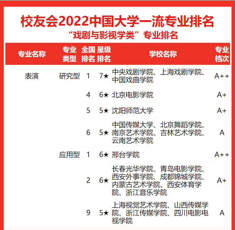 最新发布的《2022校友会中国大学排名—高考志愿填报指南》中,2022中国大学表演专业排名(应用型),我校表演专业以6★星级排名、A++专业档次、全国排名第一的综合评价夺得2022校友会中国大学表演专业排名(应用型)冠军,邢台学院继2021继续稳居2022中国大学表演专业排名(应用型)首位。