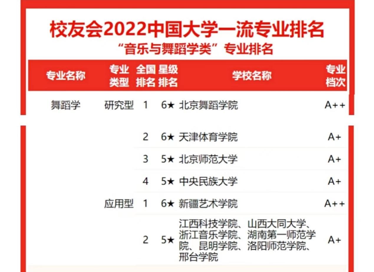 由全国第三方大学评价机构艾瑞深校友会网(Cuaa.Net)撰写完成、科学出版社出版发行的《2022校友会中国大学排名—高考志愿填报指南》最新发布校友会2022中国大学音乐与舞蹈学类一流专业排名。我校舞蹈学专业以5★星级排名、A+专业档次,获得2022校友会中国大学舞蹈学专业排名(应用型)第二名。连续两年跻身中国一流应用型专业行列前茅。
