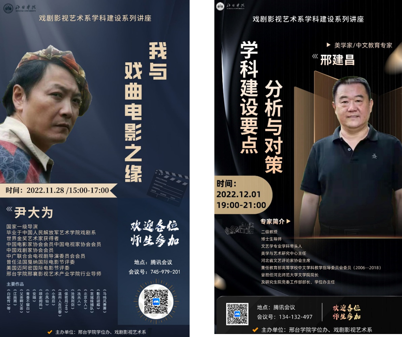 为推动戏剧影视学科建设,响应学校关于学科发展的整体规划,落实新时代高等教育高质量全面发展的新要求,戏剧影视艺术系在校学位办的大力支持和指导下,于2022年11月-12月开展学科建设系列讲座四场,分别是:11月28日著名导演尹大为主讲的《我与戏曲电影之缘》;12月1日邢建昌教授主讲的《学科建设要点分析与对策》; 12月2日李盛涛副教授主讲的《网络小说能走多远?——文学思维、疆界与中国故事》;12月8日丁建军教授主讲的《戏剧基础教学再思考》...