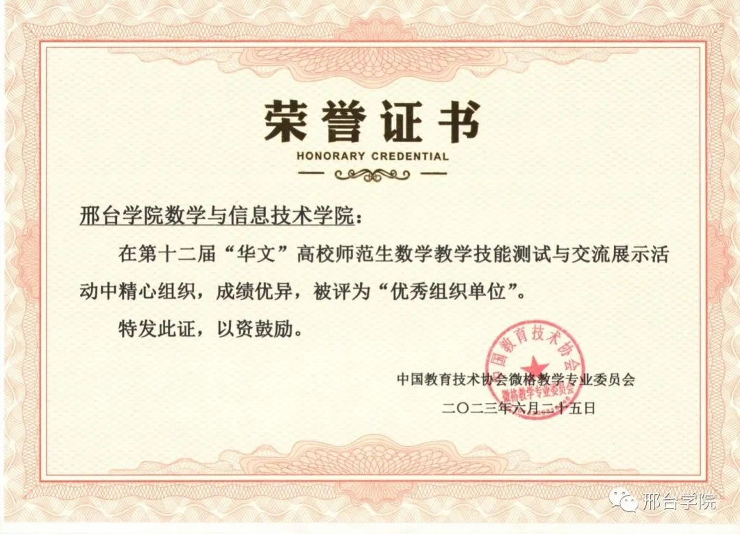 近日,我校数学与信息技术学院学生在2023年第十二届“华文杯”师范生教师技能展示活动中取得优良成绩。参赛学生展现出得扎实的教学基本功、灵活多样的教学方法、良好的精神面貌,给评委留下了深刻的印象,在微课程设计评比中,许嘉仪团队荣获国家一等奖,范欢畅团队、鲍洁团队、苏梦雅团队荣获国家三等奖;在线上教学能力展示活动中,李书婷、姜思雨荣获国家三等奖;我校被评选为“优秀组织单位”。