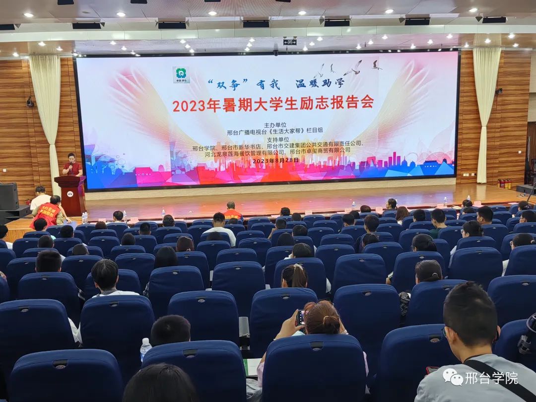 奋斗点亮青春,励志筑梦飞翔。8月28日,由邢台广播电视台《生活大家帮》栏目组主办的“双争”有我 温暖助学 2023年暑期大学生励志报告会在邢台学院体育馆学术报告厅举行。