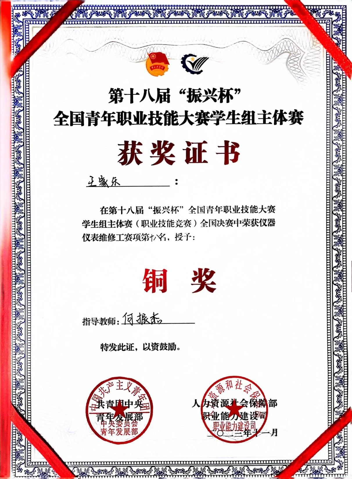 11月28日,由共青团中央、人力资源社会保障部主办的第十八届“振兴杯”全国青年职业技能大赛学生组主体赛全国决赛,在浙江杭州落下帷幕。我校机电工程学院机械电子工程2202班学生王家乐代表河北省参加仪器仪表检修工赛项,获得全国铜奖,为河北省在该项赛事中的最好成绩。