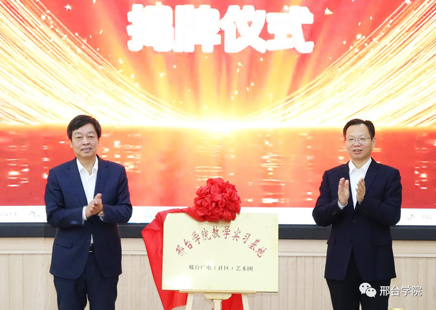 邢台广播电视台党委书记、台长唐智勇,邢台学院党委书记贾云霄为教学实习基地揭牌