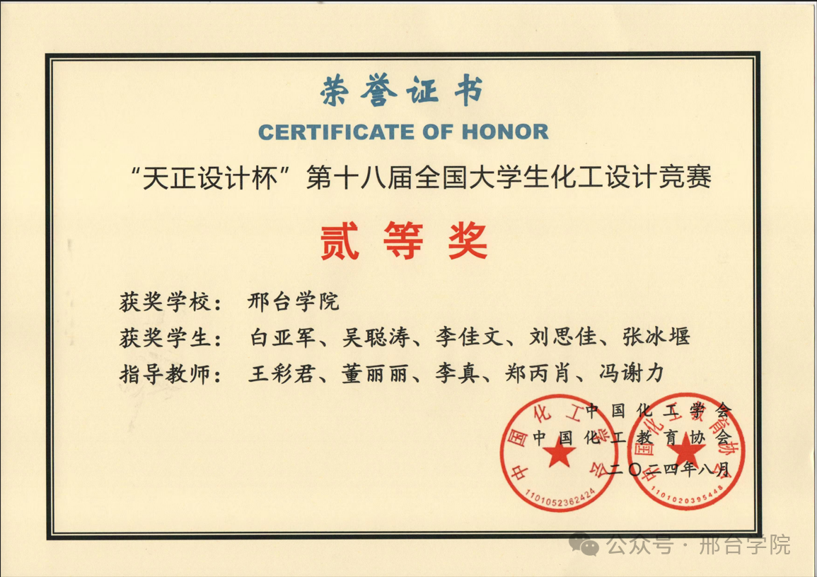 近日,由中国化工学会和中国化工教育学会联合主办的2024年第十八届全国大学生化工设计竞赛和河北省教育厅主办的第八届河北省大学生化工设计竞赛获奖名单公布,我校化学工程与工艺专业白亚军、吴聪涛、李佳文、刘思佳、张冰堰5名同学组成的“醇在即合理”团队荣获全国大学生化工设计竞赛二等奖和河北省大学生化工设计竞赛特等奖。