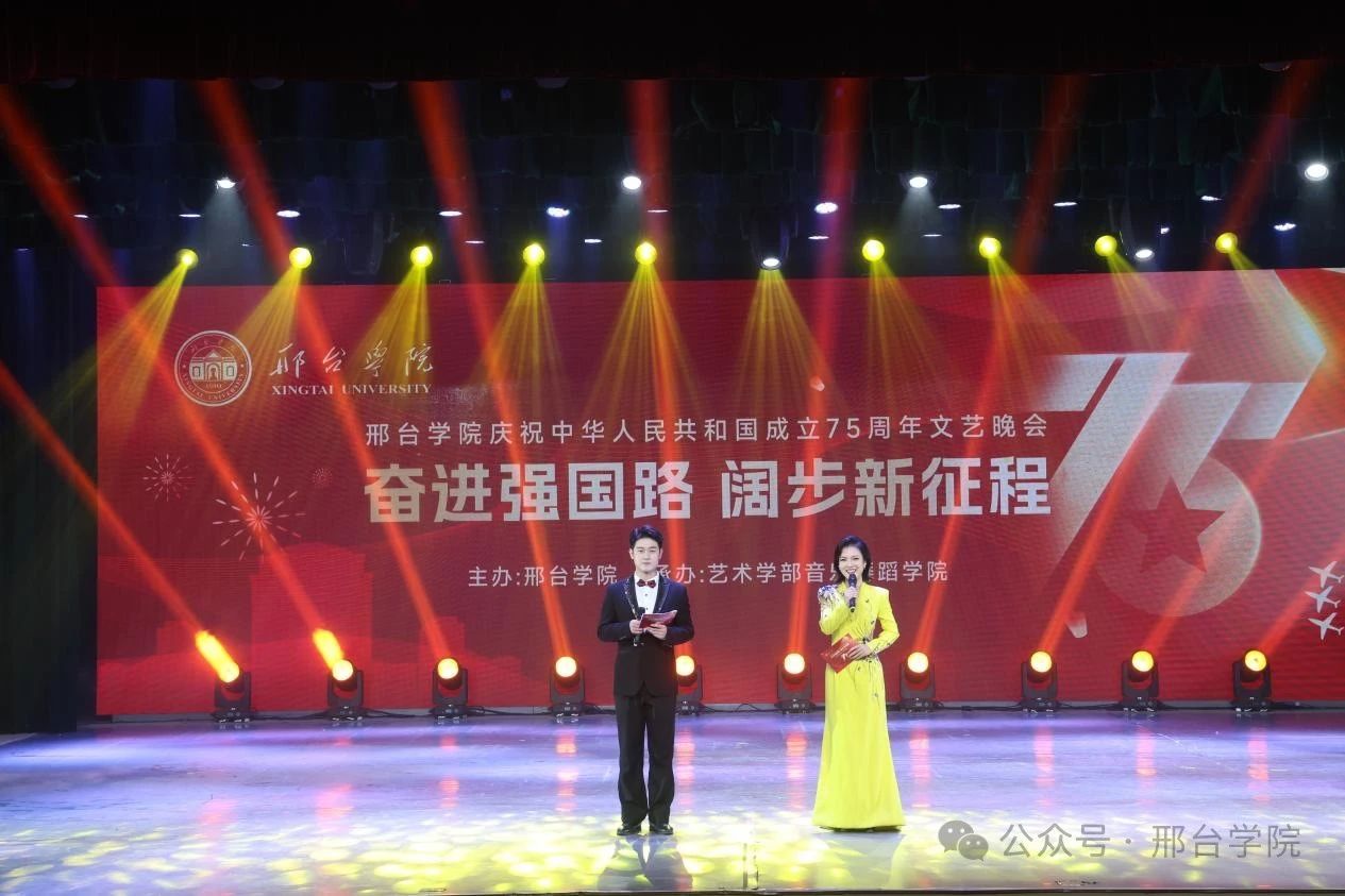 9月29晚,邢台学院音乐厅灯光璀璨、歌舞欢腾。“奋进强国路、阔步新征程”——邢台学院庆祝中华人民共和国成立75周年文艺晚会在这里举行。作为我校爱国主义教育活动月系列活动中的重要一环,晚会由艺术学部音乐舞蹈学院具体承办。襄都区委书记李秀娟,区长尚小云,区领导武立强、陈现芳、乔万国、屈春来及有关领导,我校党委书记贾云霄,校长蔡振禹,副校长徐惠敏、刘永利、王自力以及师生代表共600余人欢聚一堂,共襄盛事。