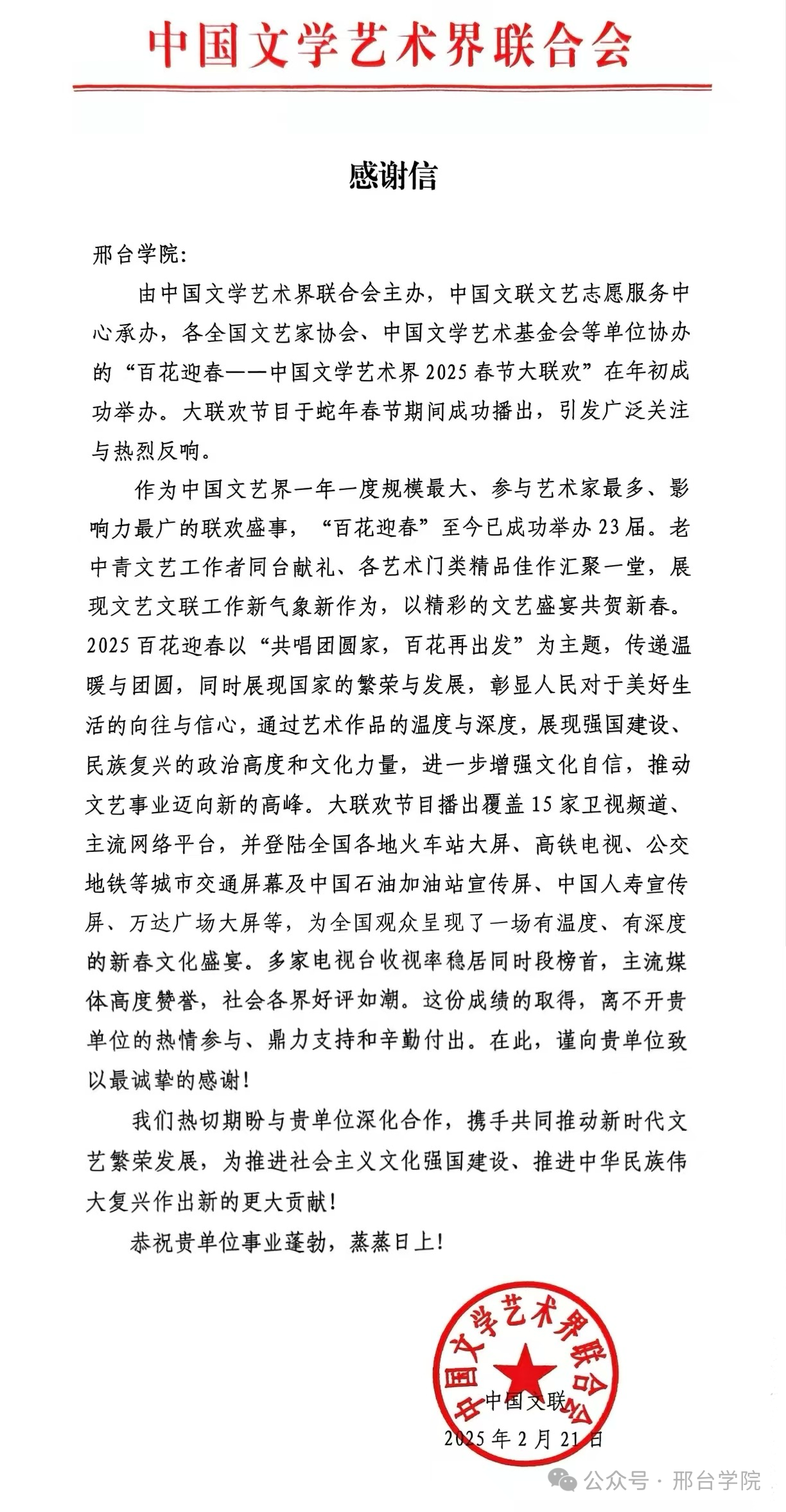 近日,我校收到来自中国文联发来的感谢信,对学校给予2025“百花迎春——中国文学艺术界大联欢”的支持,予以高度赞誉和诚挚感谢,并期盼深化合作,携手共同推动新时代文艺繁荣发展。