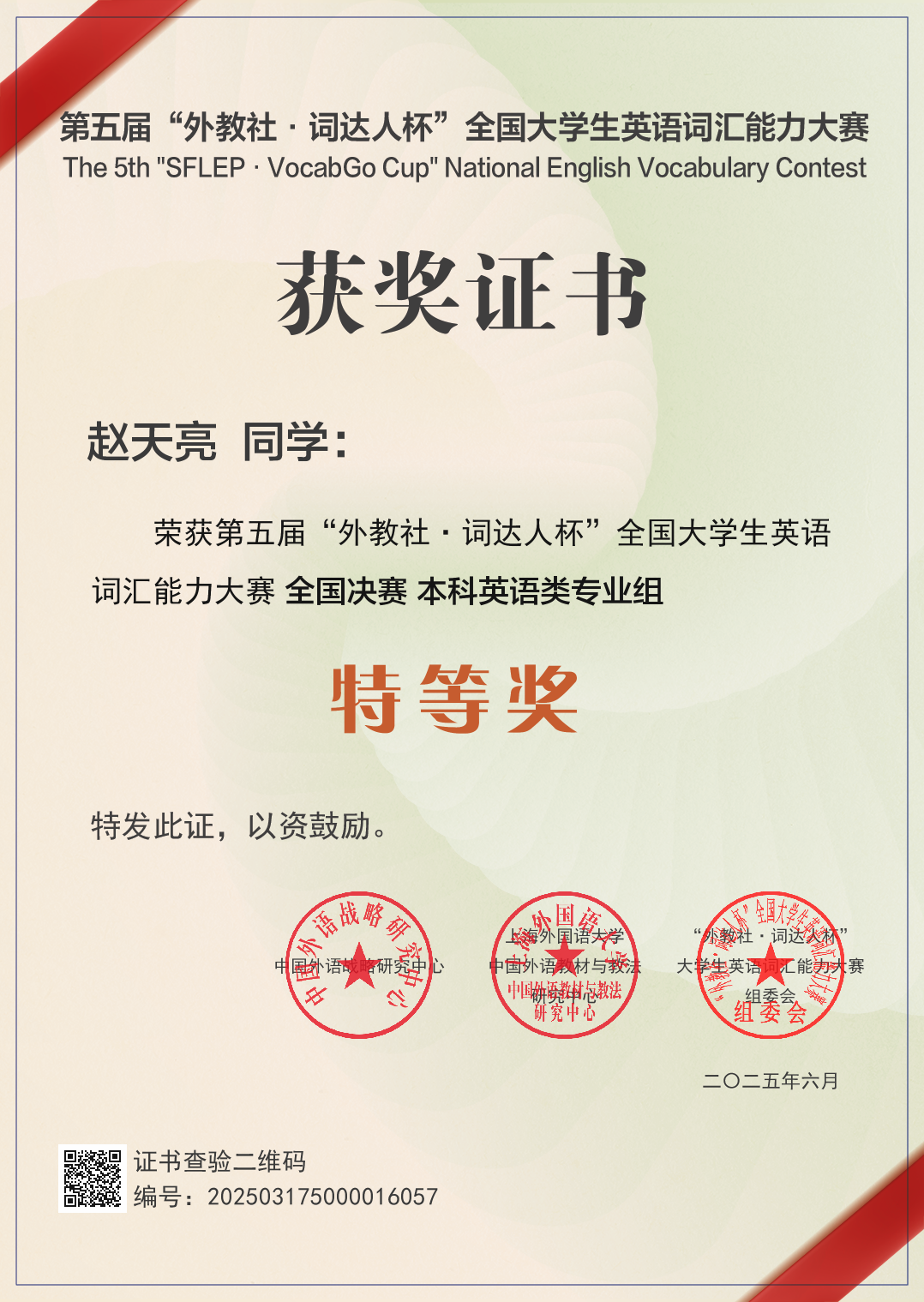 近日,由中国外语战略研究中心、中国外语教材与教法研究中心及上海外语教育出版社联合主办的第五届“外教社·词达人杯”全国大学生英语词汇能力大赛落下帷幕。来自全国高校的389名大学生参加了本届赛事。我校外国语学院学生赵天亮经校赛、省赛环节,以省赛特等奖的优异成绩进入国赛,最终凭借扎实的英语词汇功底,荣获国赛特等奖榜单第一名的历史最高成绩。
