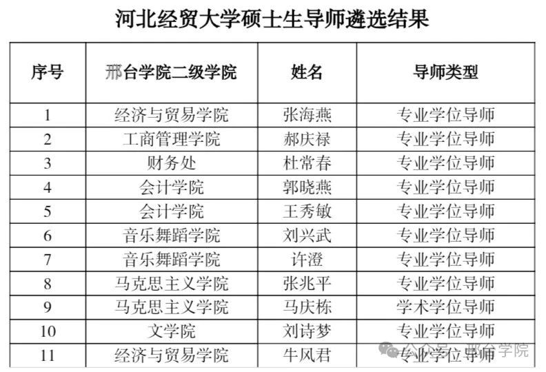 近日,经河北经贸大学学位评定委员会严格审议,我校张海燕等 11 位教师受聘为该校研究生导师。此次新增导师队伍覆盖管理学、艺术学、马克思主义等核心学科,是我校深化校际协同育人、推进硕士学位授予单位建设的又一重要进程,为学科内涵式发展与硕士点培育注入新活力。