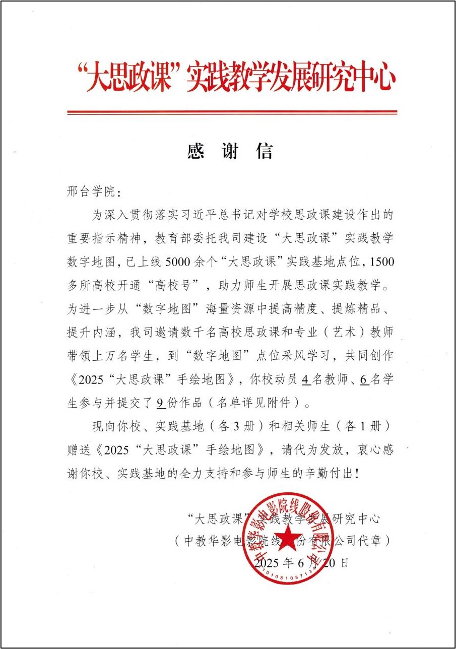 近日,2025“大思政课”手绘地图由教育部正式发布。我校马克思主义学院联合中国人民抗日军政大学陈列馆提交的《弘扬抗大精神 建设教育强国》《革命热土上的青春印记》两部视频及“中国人民抗日军政大学陈列馆手绘元素”入选。教育部“大思政课”实践教学发展研究中心特向我校发来感谢信,对我校组织师生积极参与创作《2025“大思政课”手绘地图》表示感谢并赠送手绘地图!