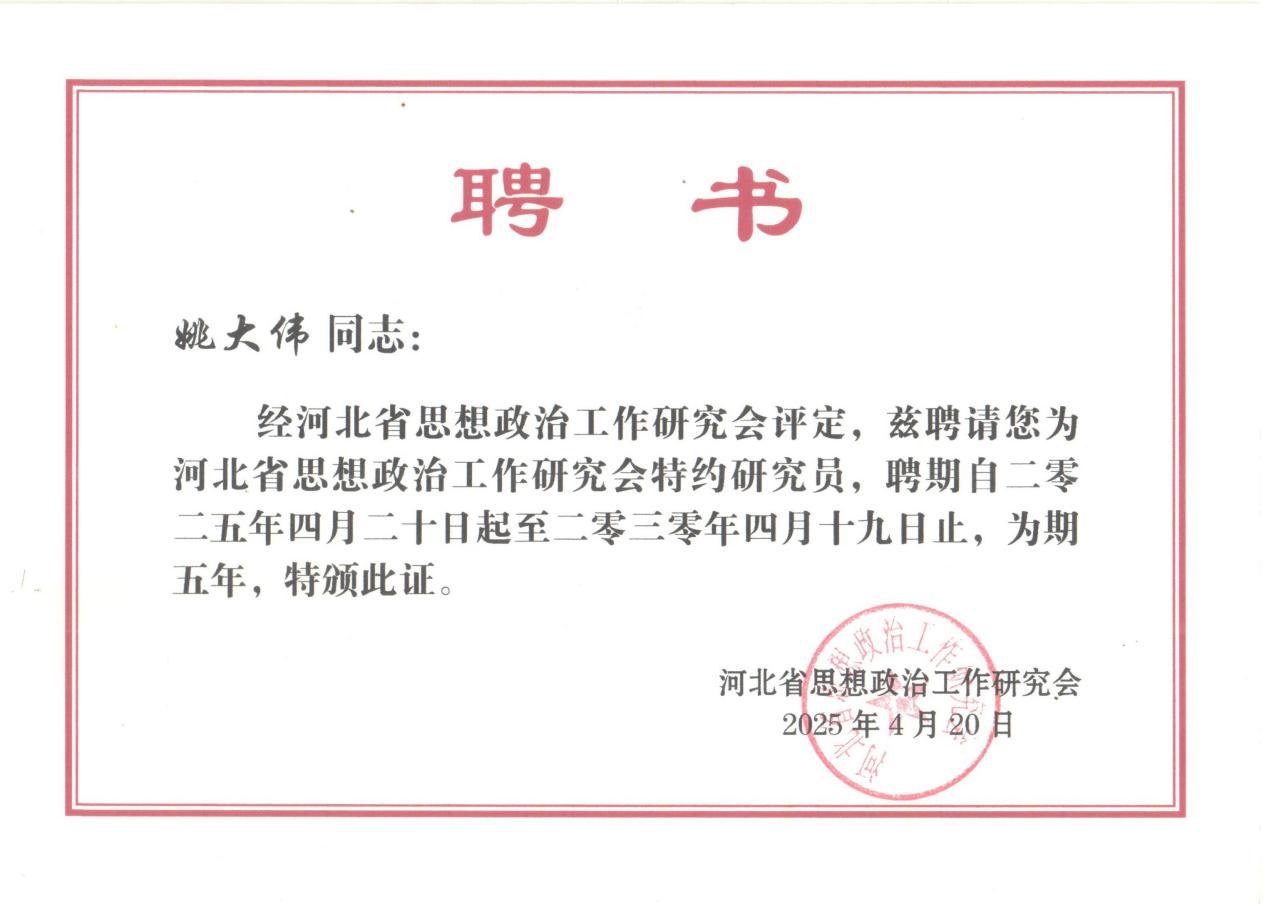 此次聘任是对我校思政教育工作的高度认可,也为学校深化思政工作创新、思政工作研究发展提供了重要平台。下一步,学校将紧密携手河北省思想政治工作研究会,借助其丰富资源与专业渠道,深入开展思政工作研究与实践,按照《...