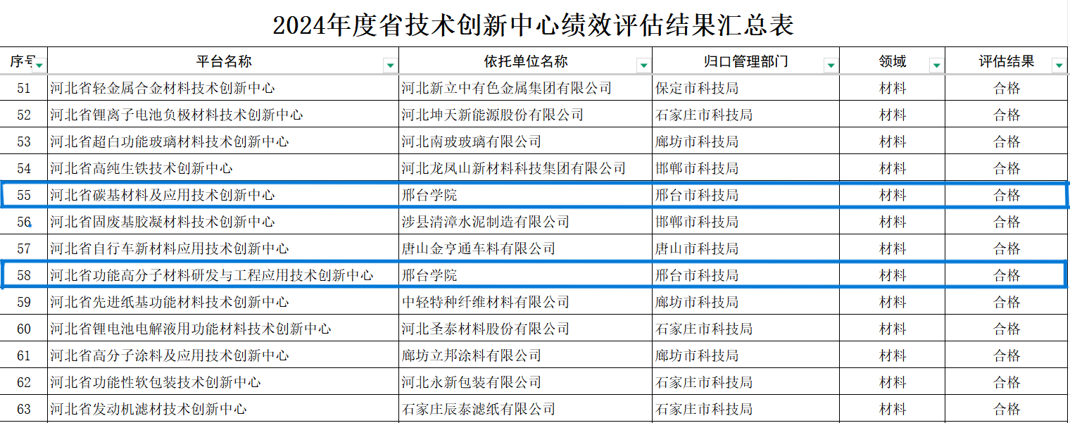 近日,河北省科学技术厅公布2024年度省重点实验室、技术创新中心绩效评估结果,依托我校建设的河北省碳基材料及应用技术创新中心、河北省功能高分子材料研发与工程应用技术创新中心、河北省“邢枣仁”利用技术创新中心、河北省数字化淡水水产养殖技术重点实验室等4个省级科研平台全部顺利通过评估,充分彰显了我校在科研平台建设与科技创新领域的实力。